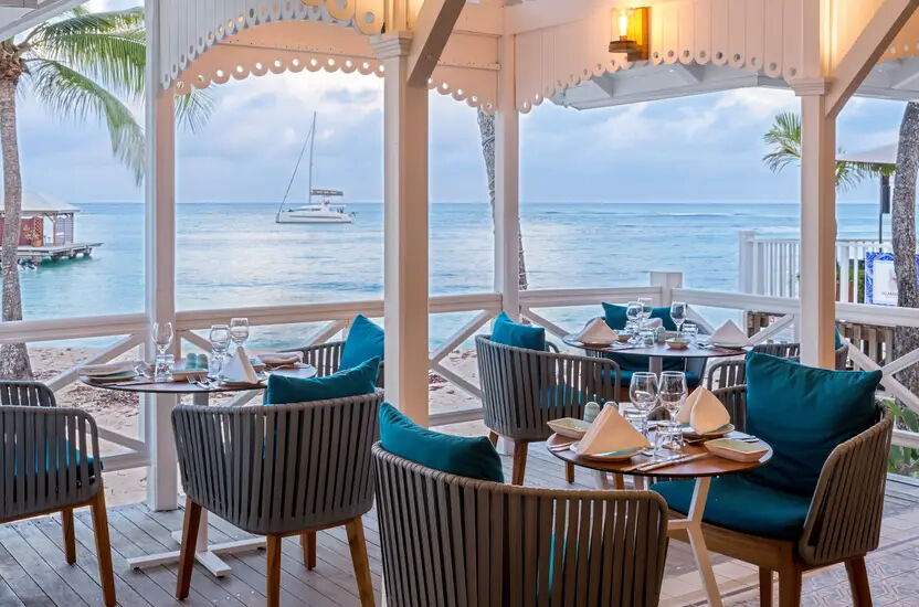 Speisen Sie auf der weitläufigen Terrasse im karibischen Stil, die mit einem